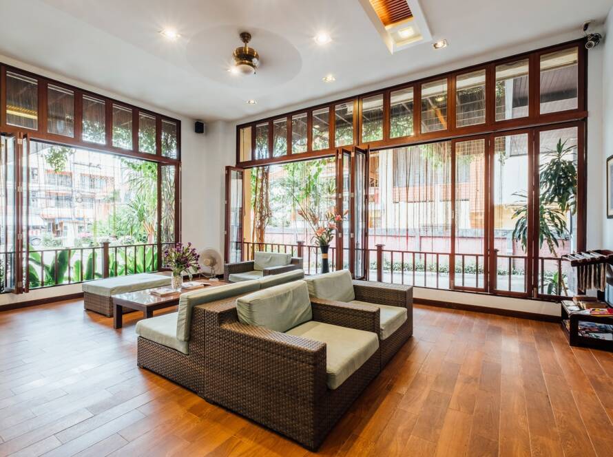 Vintage village home design with new modern windows